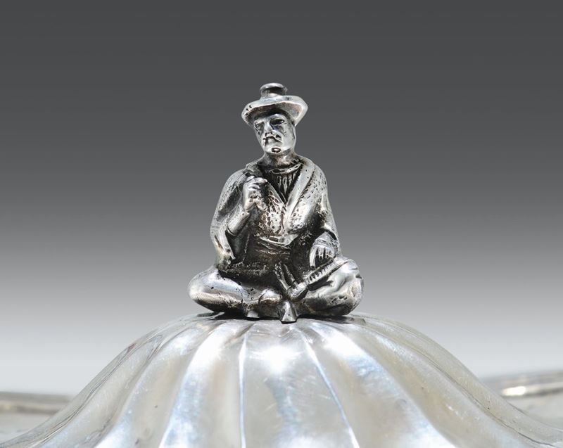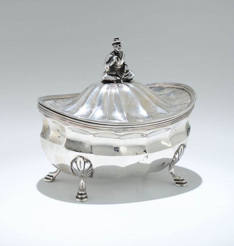 corpo ovale sagomato a barca con larghe scanalature verticali poggiante su quattro poedini gradinati con attacco a foglia stilizzata, coperchio a pagoda con presa a forma di figura di orientale seduto.gr. 260, cm 12,5x9,5x12