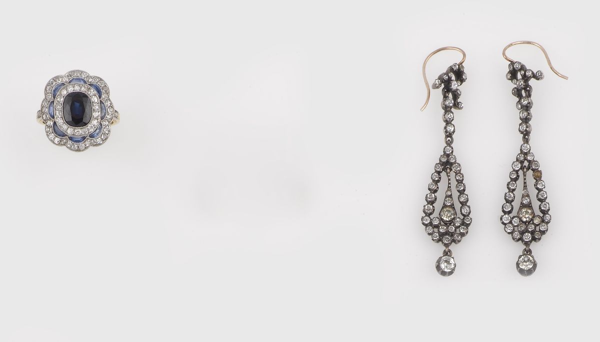 A group including a sapphire and diamond ring and a pair of silver and paste earrings