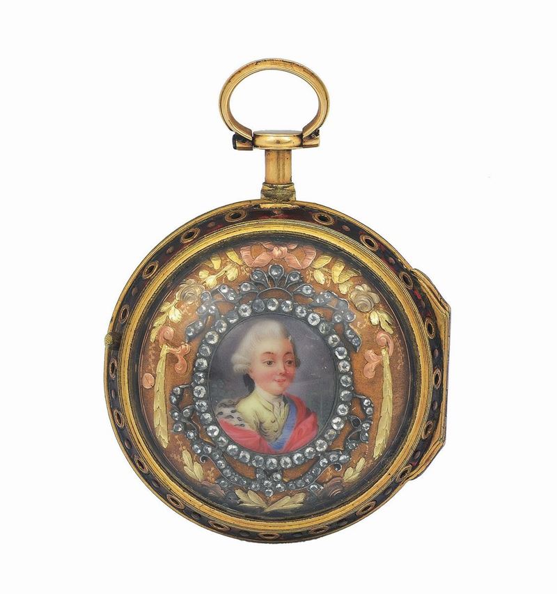 CASE: Outer: two-body, the back set with a painted on enamel portrait of a young gentleman holding a book, gold border with paste-set border and foliage, band engraved with repeated pattern, paste-set bezel. Inner: two-body, “bassine” polished with deep back.DIAL: White enamel, radial Roman numerals, outer minute track with five-minute Arabic numerals. Paste-set elaborate hands.MOVEMENT: hinged, frosted gilt full-plate with pentagonal baluster pillars, fusee and chain, verge escapement, three-arm brass balance with flat balance spring, single-footed cock with ruby-paste endstone. Dial and movement signed, in good condition, Overhaul recommended, at buyer's expenseDIAM: 40 mm.NOTE: Jean Robert Soret (1731-1799) Master watchmaker from a horological family of at least three generations. One member of the family, Frédéric, worked in London; he may have represented the family in the English market.