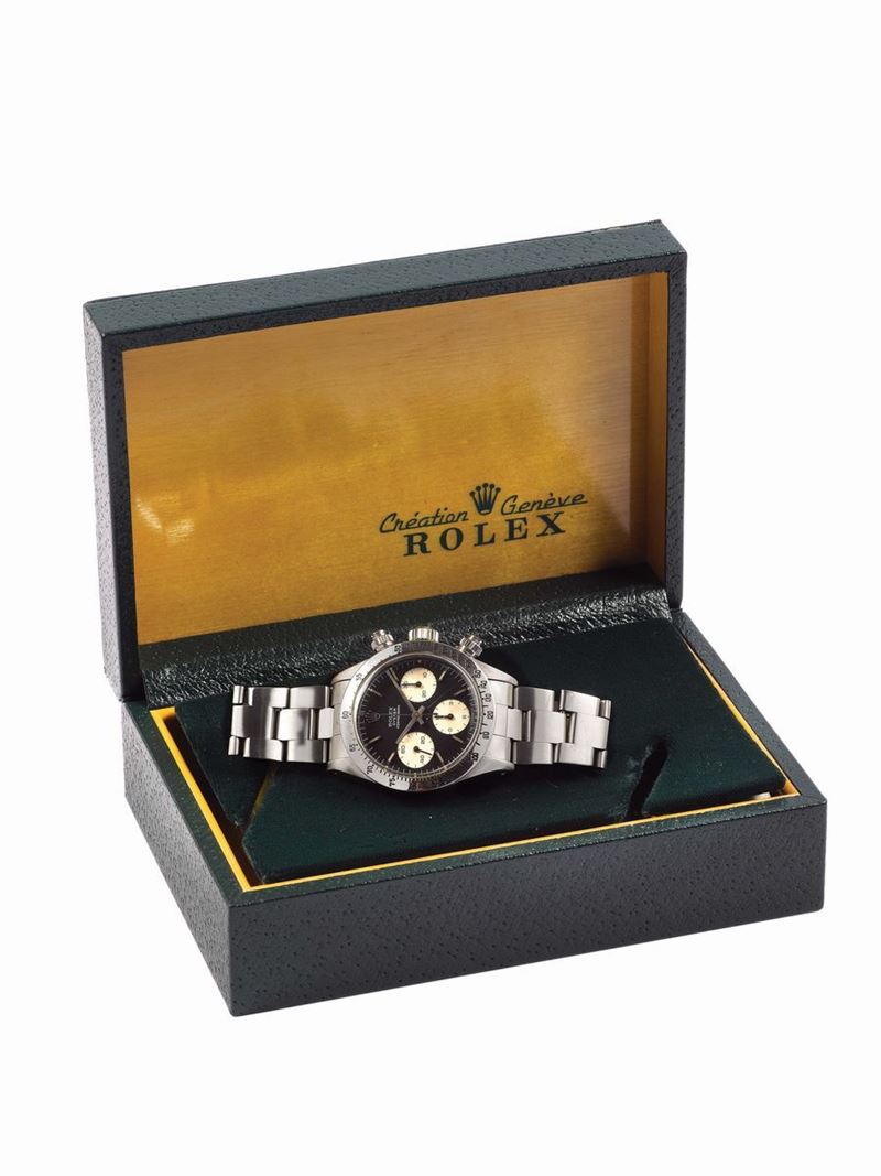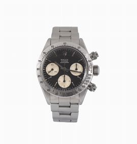 CASE : Three-body, polished and brushed, screwed-down case back, buttons and Triplock winding crown, tachometer graduation on the bezel to 200 units per hour.DIAL : Bicolor black and silver with applied baton indexes and luminous dots, outer minutes/seconds divisions, subsidiary guilloché dials for the seconds, the 12-hour and 30-minute registers. Luminous steel baton hands.Movement: Cal. 727, rhodium-plated, 17 jewels, straight-line lever escapement, monometallic balance with Microstella regulating screws, adjusted to 3 positions, shock absorber, self-compensating Breguet balance spring.Dial, case and movement signed, in good conditionDIAM: 37 mm. THICKNESS: 13 mm.NOTE: A Sigma dial is a Rolex dial named for the letters printed at the bottom of the dial at 6 o’clock. Most Daytona dials are marked with “T Swiss T,” however a Sigma dial is marked “ T SWISS T .” These Daytona’s get the name from the two O shaped symbols on each side of the “T SWISS T.” Dials marked with this lettering are fitted with solid gold markers, unlike other dials which may use steel or other materials. Sigma dials come in both yellow and white gold and are very rare.