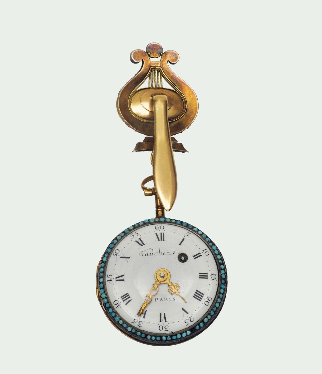 CASE: Two-body, Louis XVI, the front cover and pendant with tourqoise, transparent case backDIAL: White enamel, radial Roman numerals, outer dot minute divisions with five-minute Arabic numerals, winding aperture at 2. Gold Louis XVI hands.MOVEMENT: frosted gilt full plate with flared cylindrical pillars, fusee and chain, verge escapement with micrometric potence adjustment, brass balance with flat balance spring, silver regulation dial. Dial and movement signed, in quite good conditionDIAM: 39 mm.NOTE: Daniel Vaucher, made Master in 1767, is listed as working in Paris at Rue St. Pierre aux Boeufs from 1769-1790