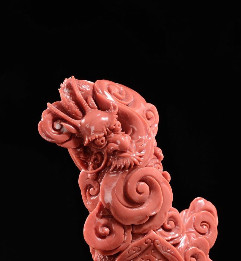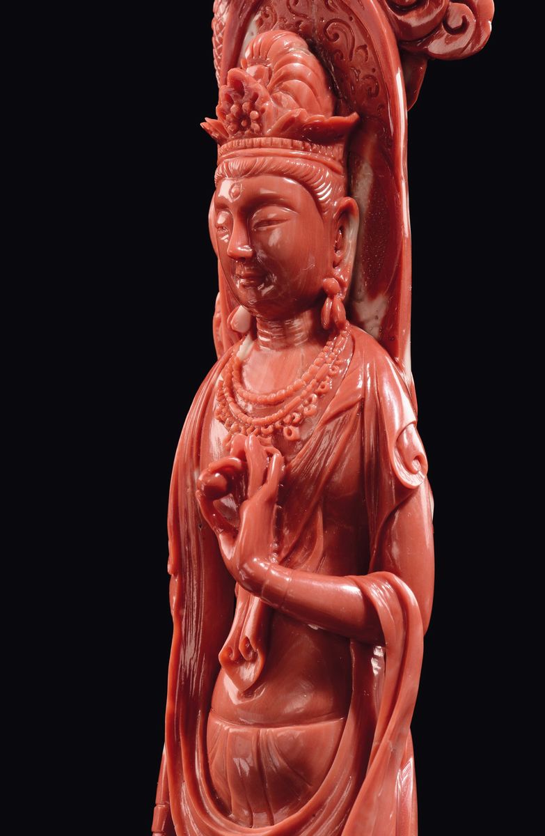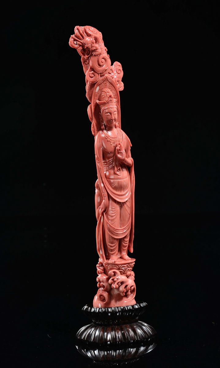 A carved coral Guanyin figure with aura and dragon, China, Qing Dynasty, late 19th century