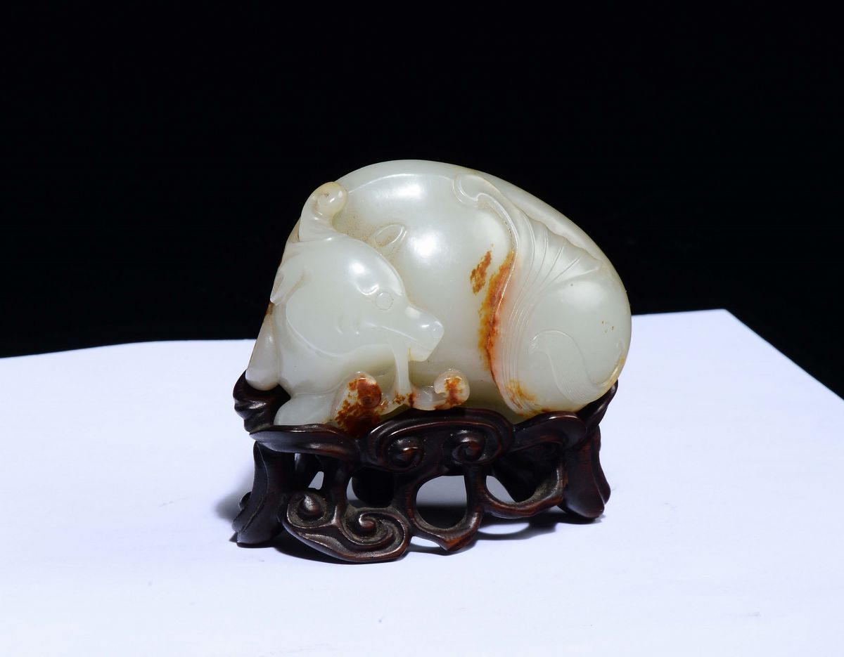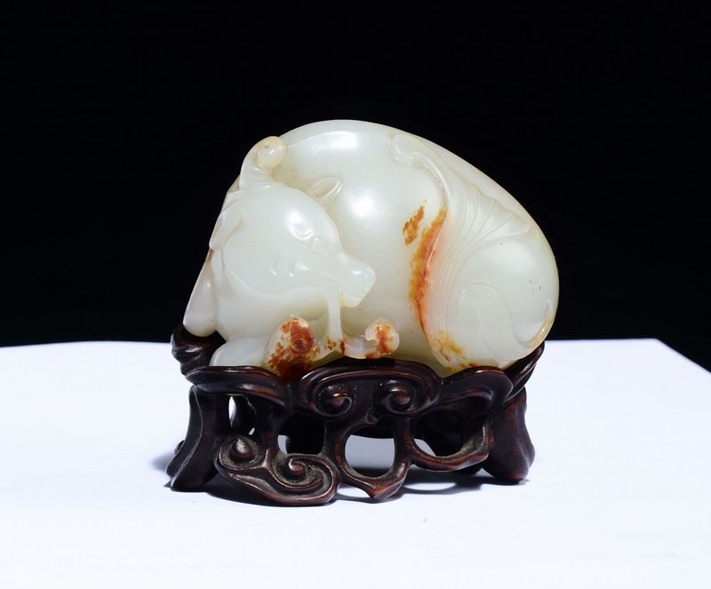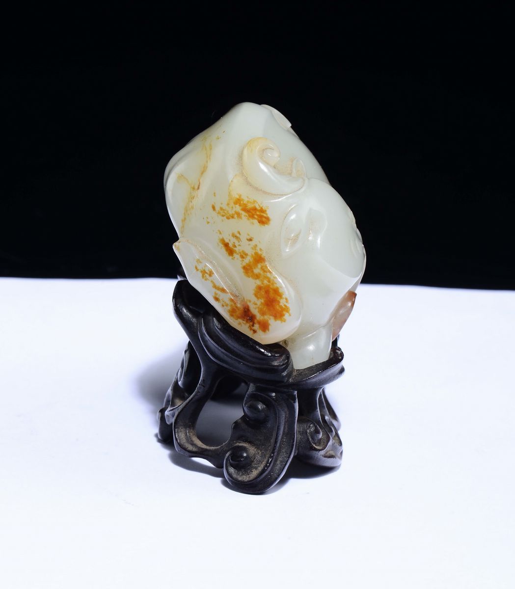 A Celadon white and russet jade mythical beast and mushroom, China, Qing Dynasty, 18th century