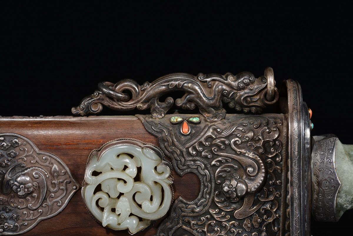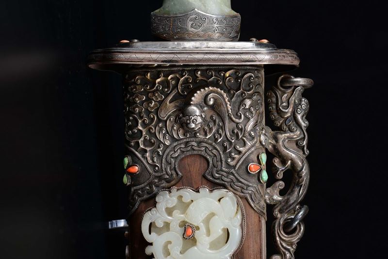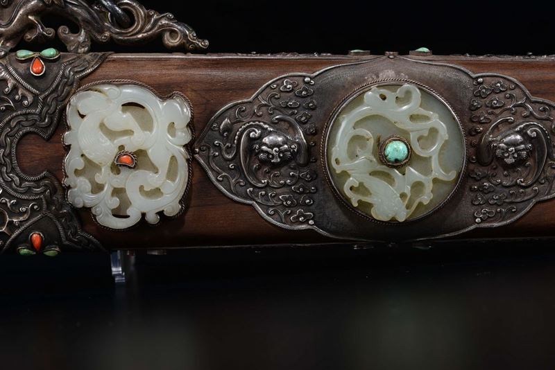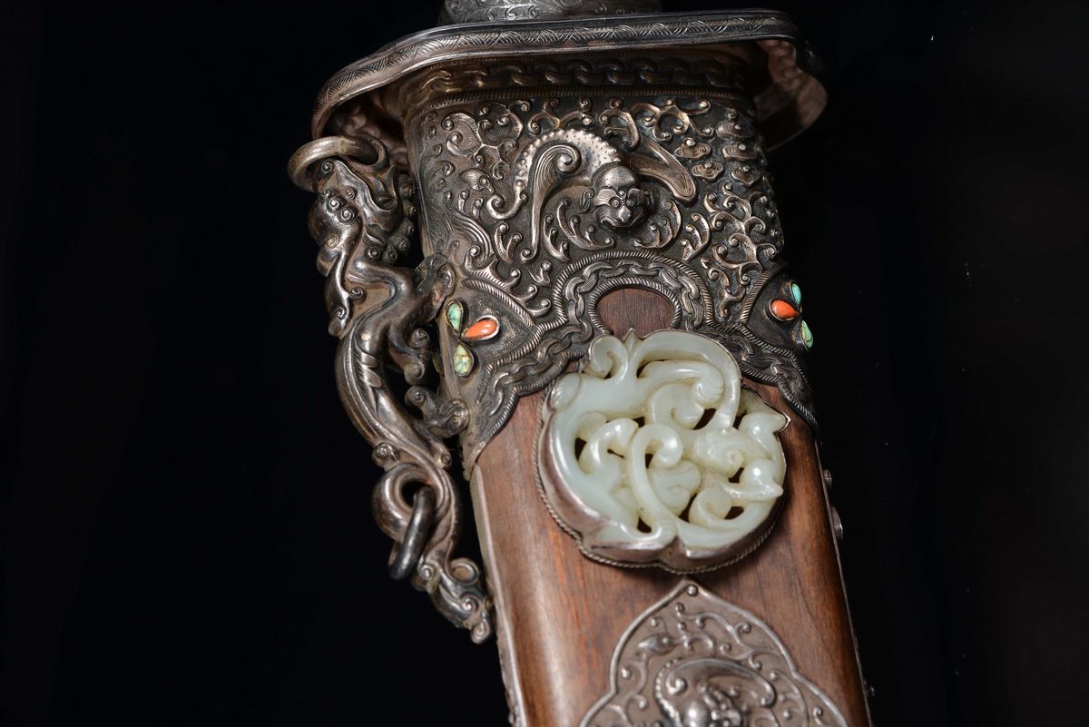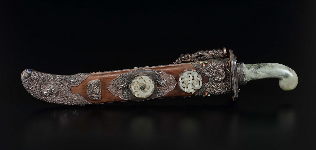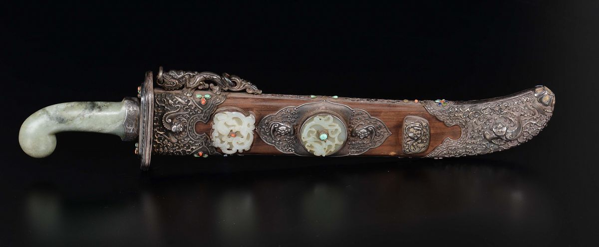 A dagger with handle and scappard with white jade and semi-precious stone inlays, China, Qing Dynasty, 18th/19th century