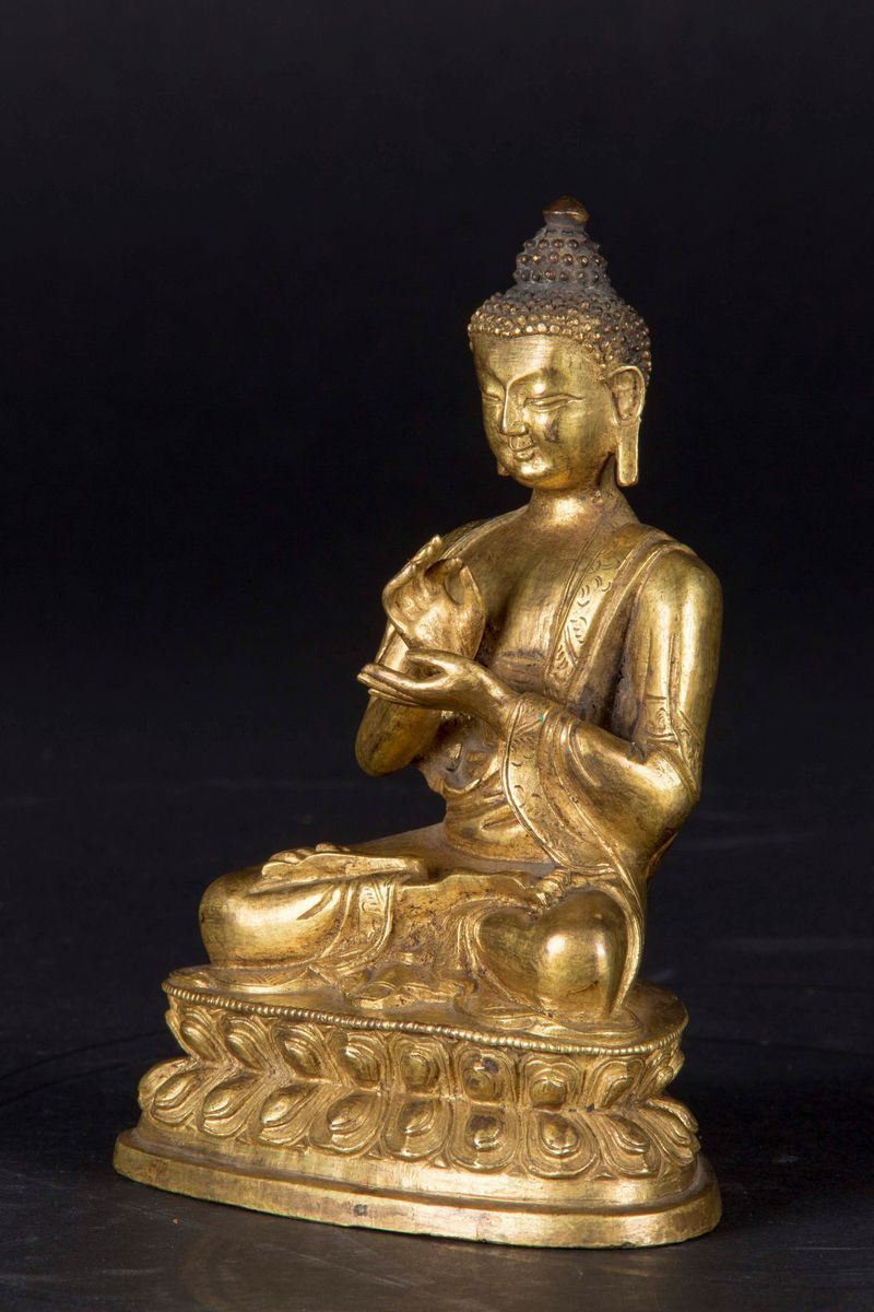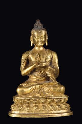 A gilt bronze figure of Sakyamuni on a double lotus flower, China, Qing Dynasty, 18th century