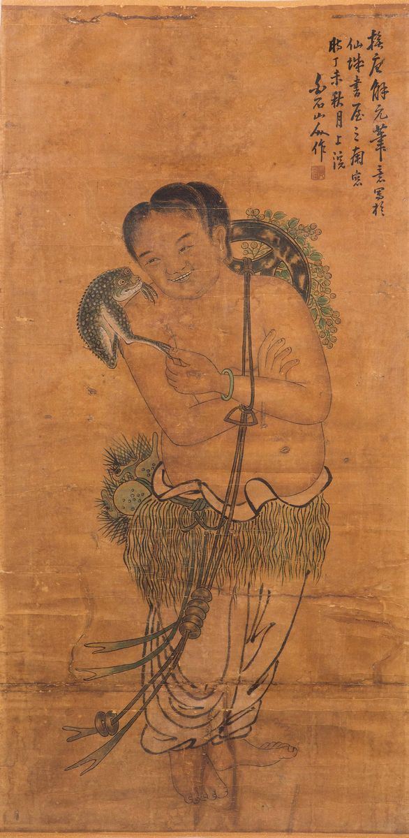 A painting on paper depicting boy with a frog and inscription with Jie Yuanhua' signature, China, Qing Dynasty, 18th cent [..]