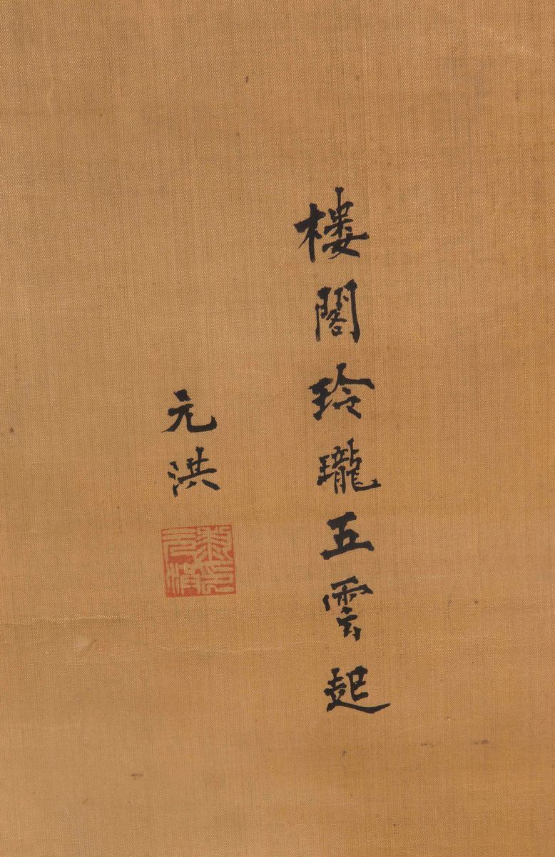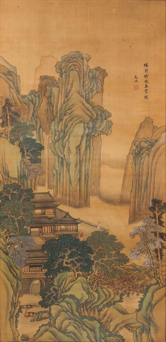 A painting on paper depicting mountain landscape with pagoda and inscription with Yuan Hong' signature, China, Qing Dynasty, [..]