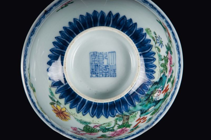 A pair of polychrome enamelled porcelain bowls with floral decoration, China, early 20th century