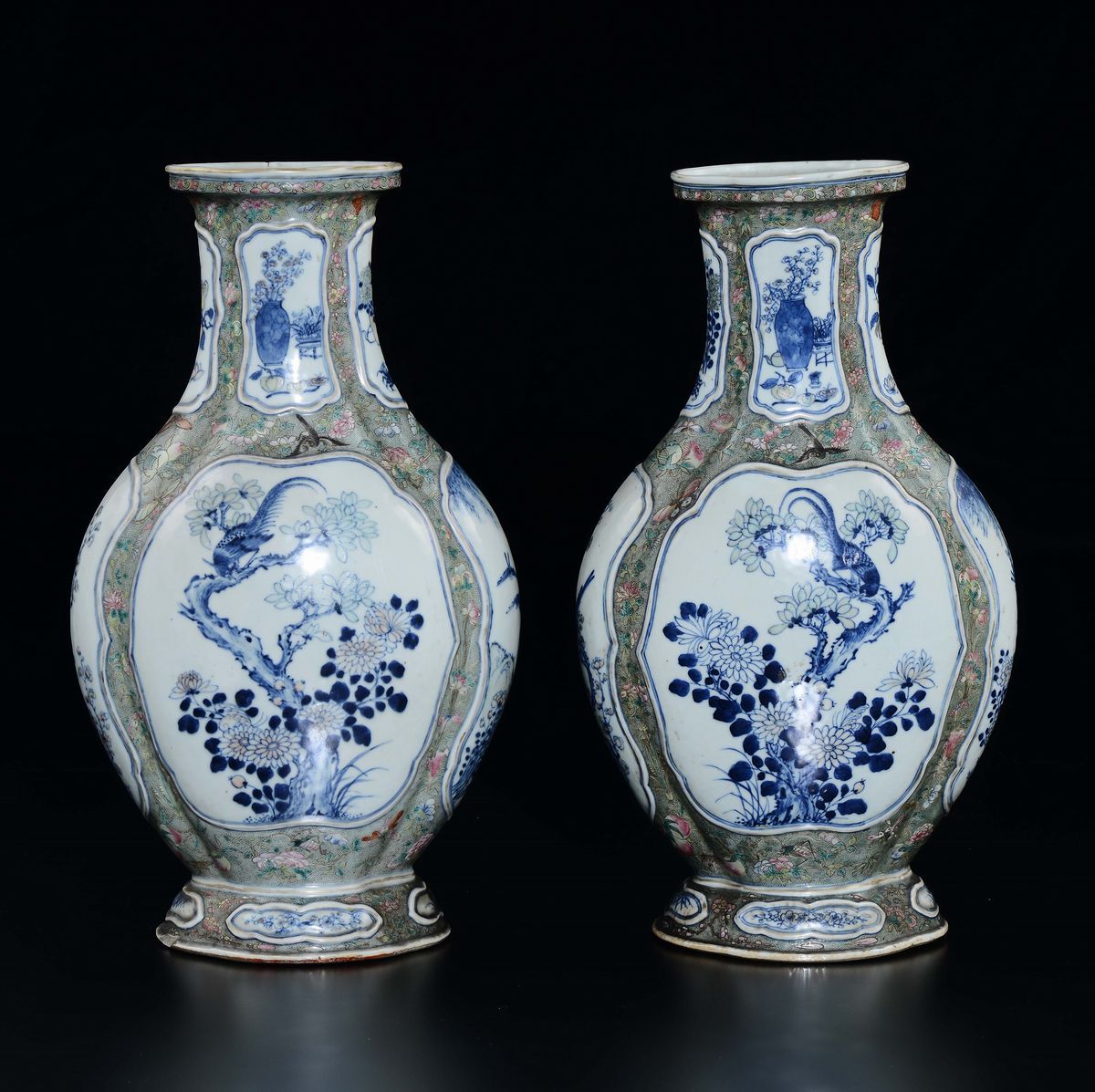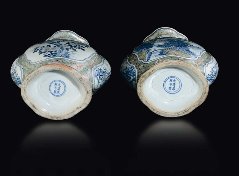 A pair of polychrome enamelled porcelain vases with blue and white reserves depicting river landscapes and floral decoration, China, Qing Dynasty, 19th century