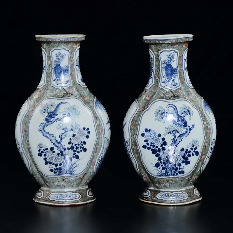 A pair of polychrome enamelled porcelain vases with blue and white reserves depicting river landscapes and floral decoration, [..]