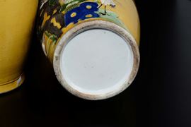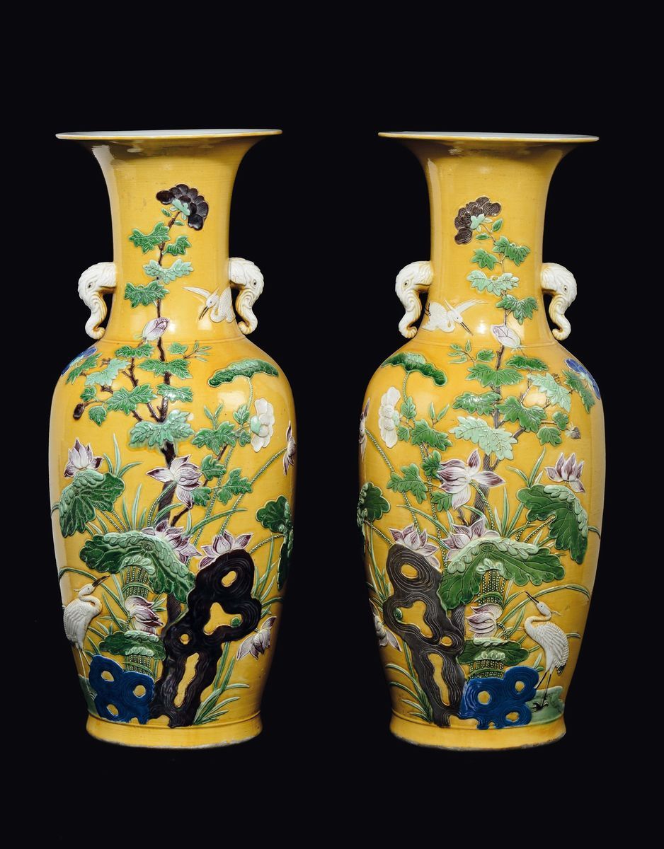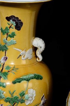 A pair of yellow-ground porcelain vase with elephant-head handles, China, Qing Dynasty, 19th century