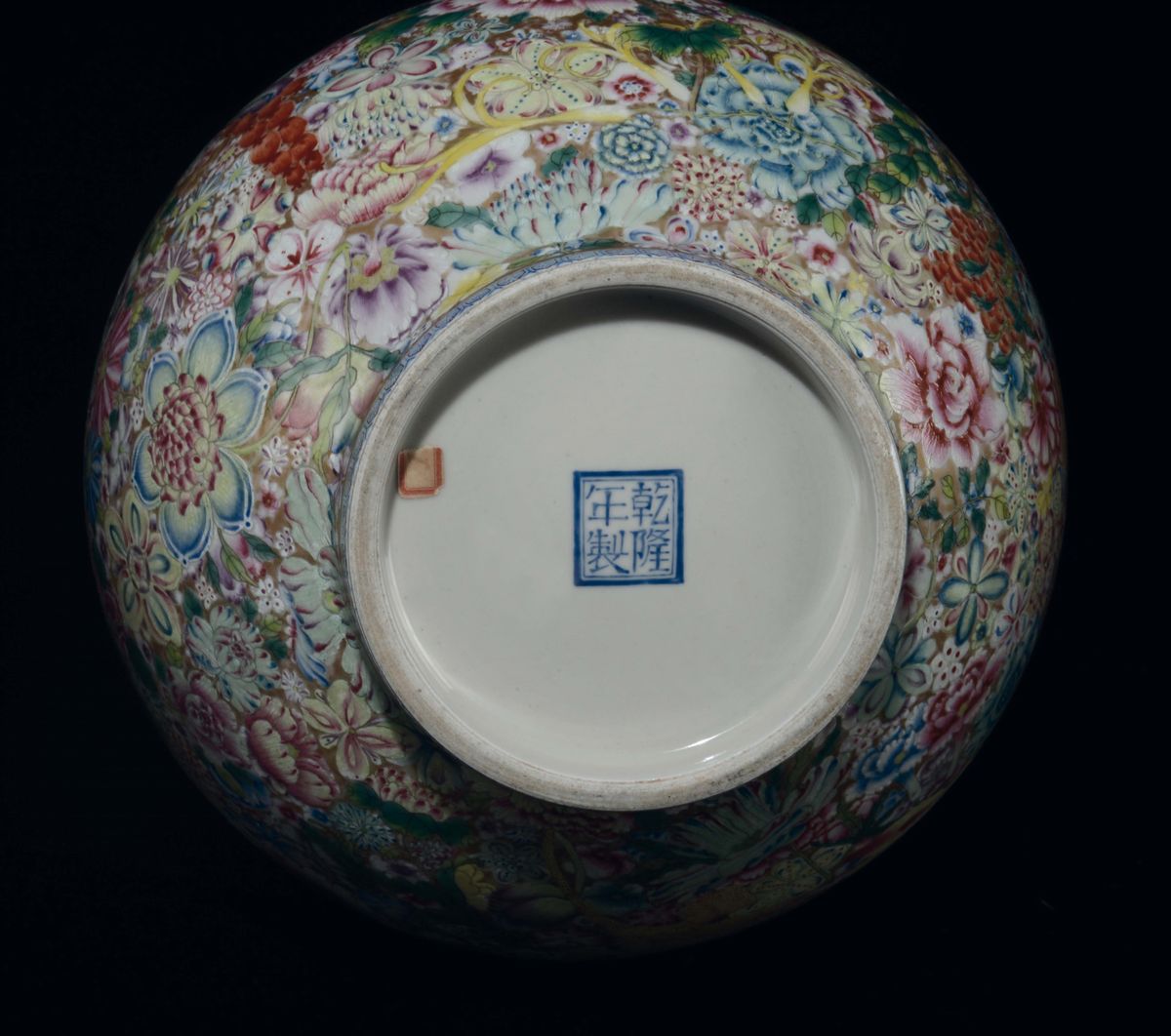 A polychrome enamelled milleflor-ground porcelain bottle vase, China, Qing Dynasty, early 20th century