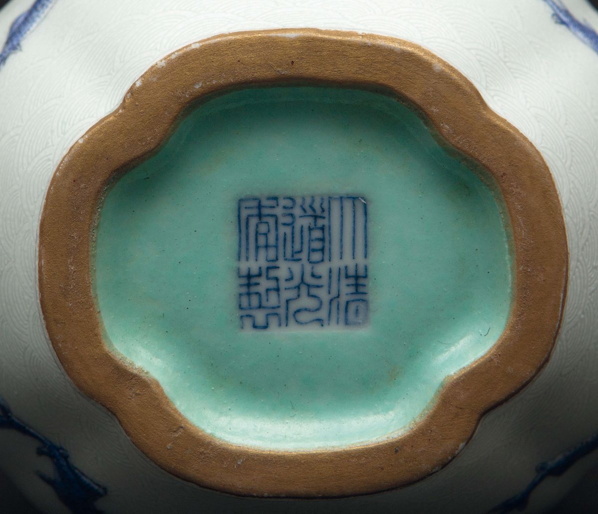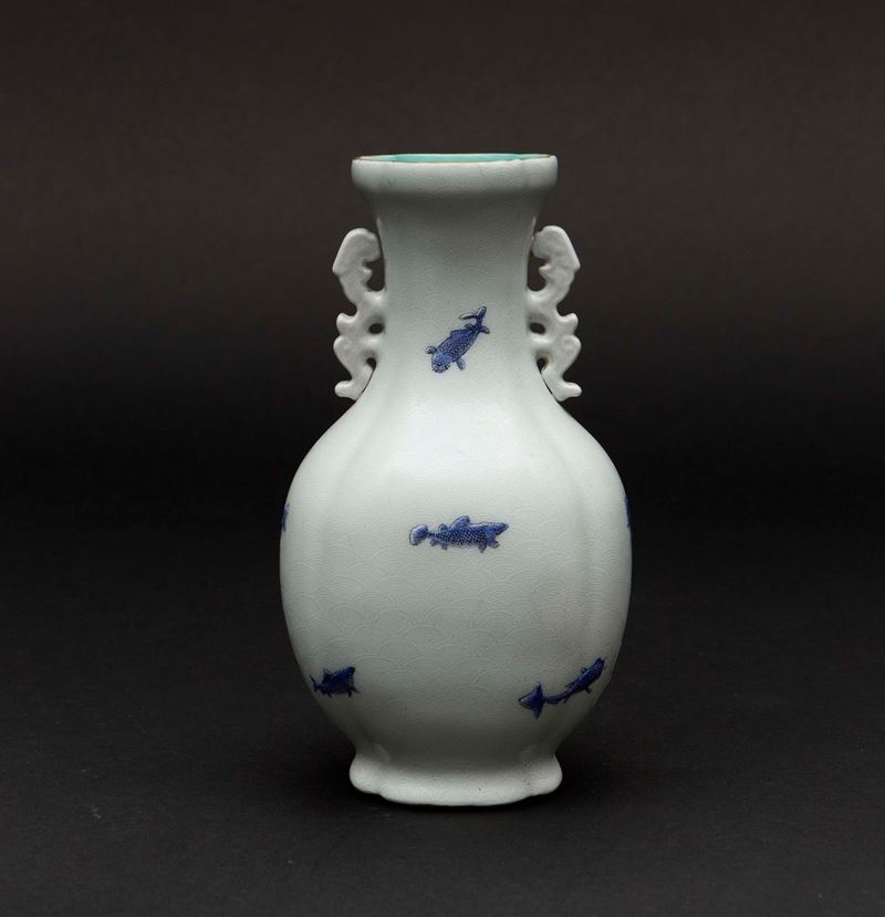 A porcelain double handled vase depicting blue fish, China, Qing Dynasty, Daoguang Mark and of the Period (1821-1850)
