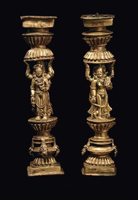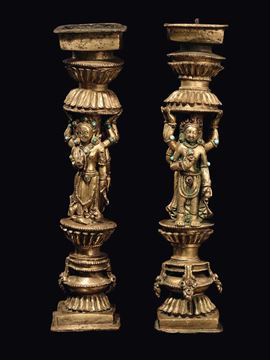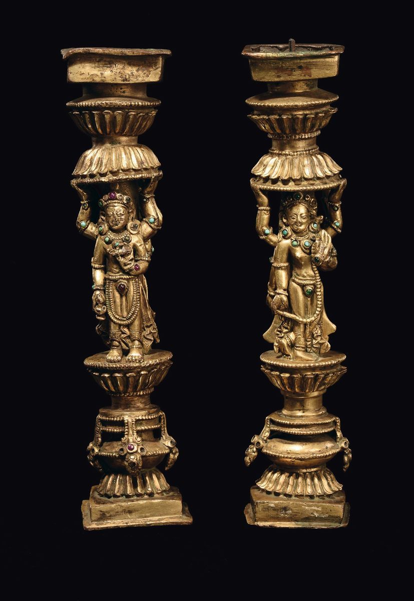 A rare pair of gilt bronze ornament with semi-precious stones inlays, Densatil monastery taste, Tibet, 15th century