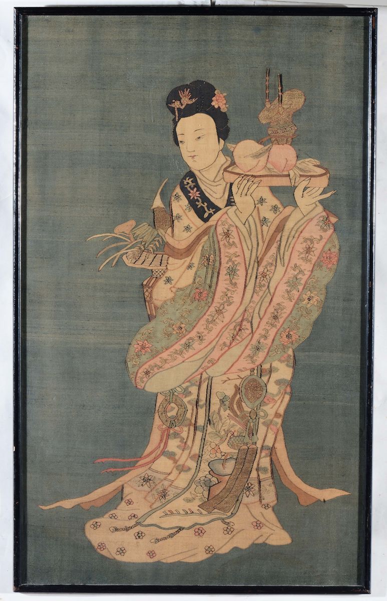A silk blue-ground Kesi depicting Guanyin with tray, China, Qing Dynasty, 19th century