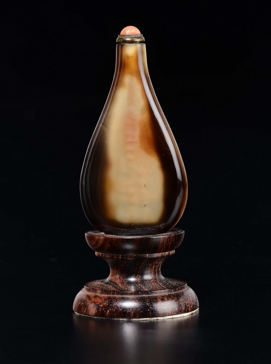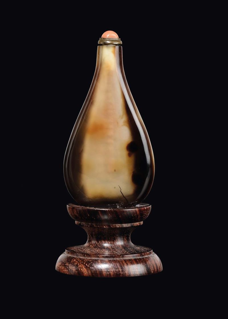 A tiger's-eye snuff bottle with coral stopper, China, Qing Dynasty, 19th century