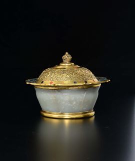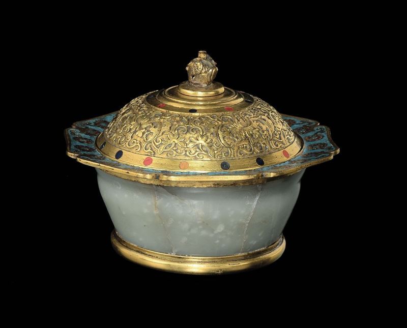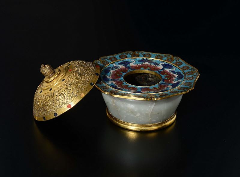 A white jade and gilt bronze cloisonné enemel vase and cover, China, Qing Dynasty, 18th century