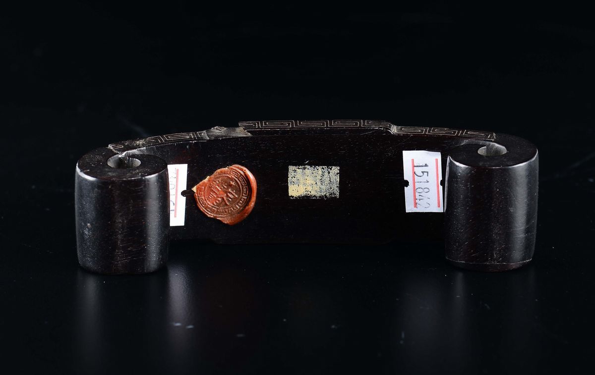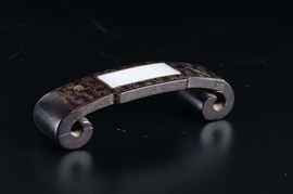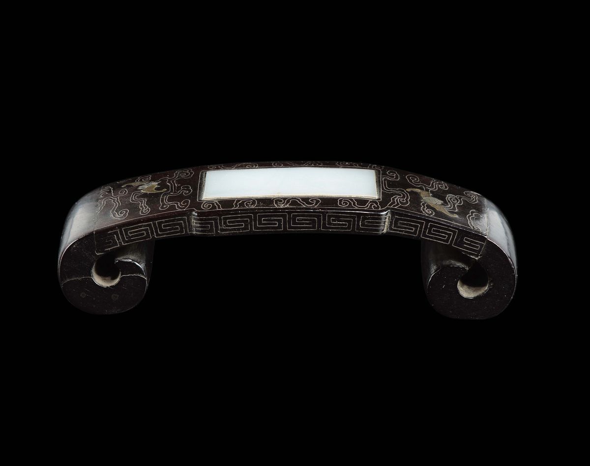 A zitan wrist-rest with white jade plaque with silver inlays between bats, China, Qing Dynasty, 18th century