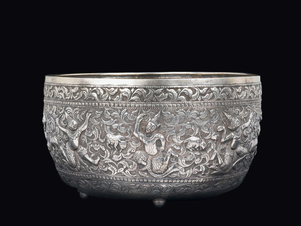 An embossed silver bowl with dancing figures, India, 19th century