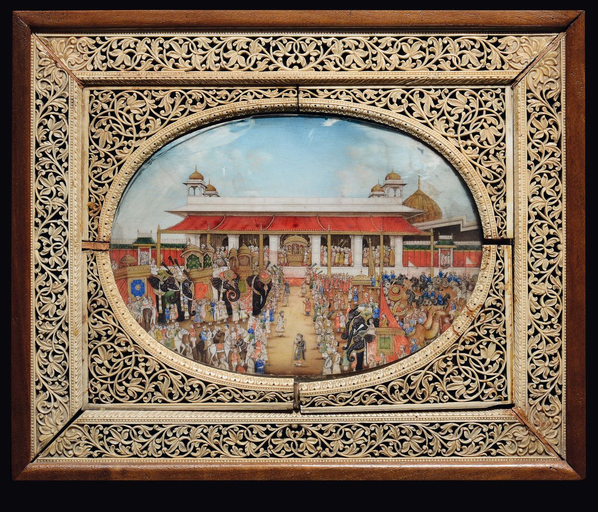 An ivory miniature depicting a royal worship on a fretworked frame, India, 19th century