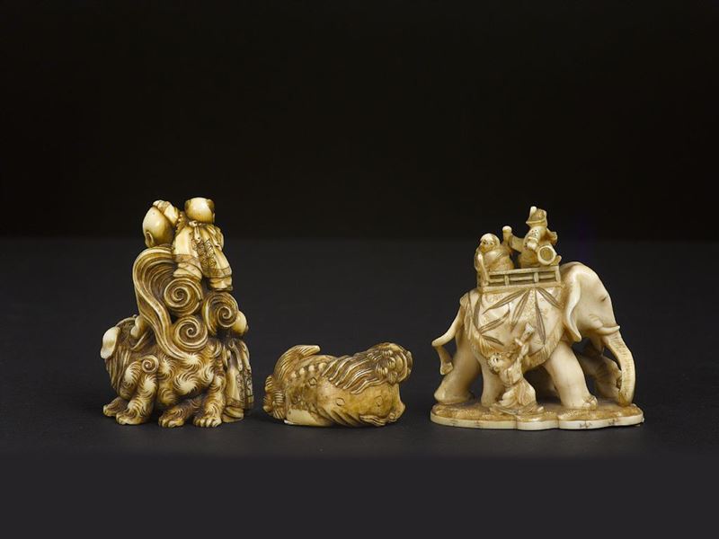 Three carved ivory group with children, a wise man with stick, Pho dogs and elephant, Japan, Meiji Period, 19th century