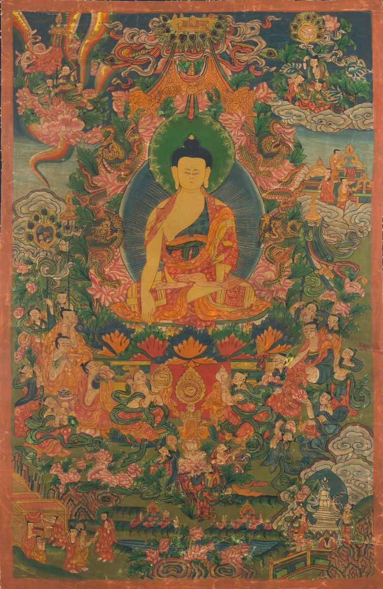 Two green-ground tanka, one with Buddha and one with Ganesh, Tibet, 19th century