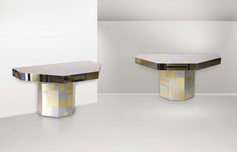 Tavolo in legno rivestito con placche in acciaio cromato e ottone per la serie Cityscape. Firma originale. Prod. Directional, USA, 1970 cm 200x74x69(chiuso cm 138x74x69 )
