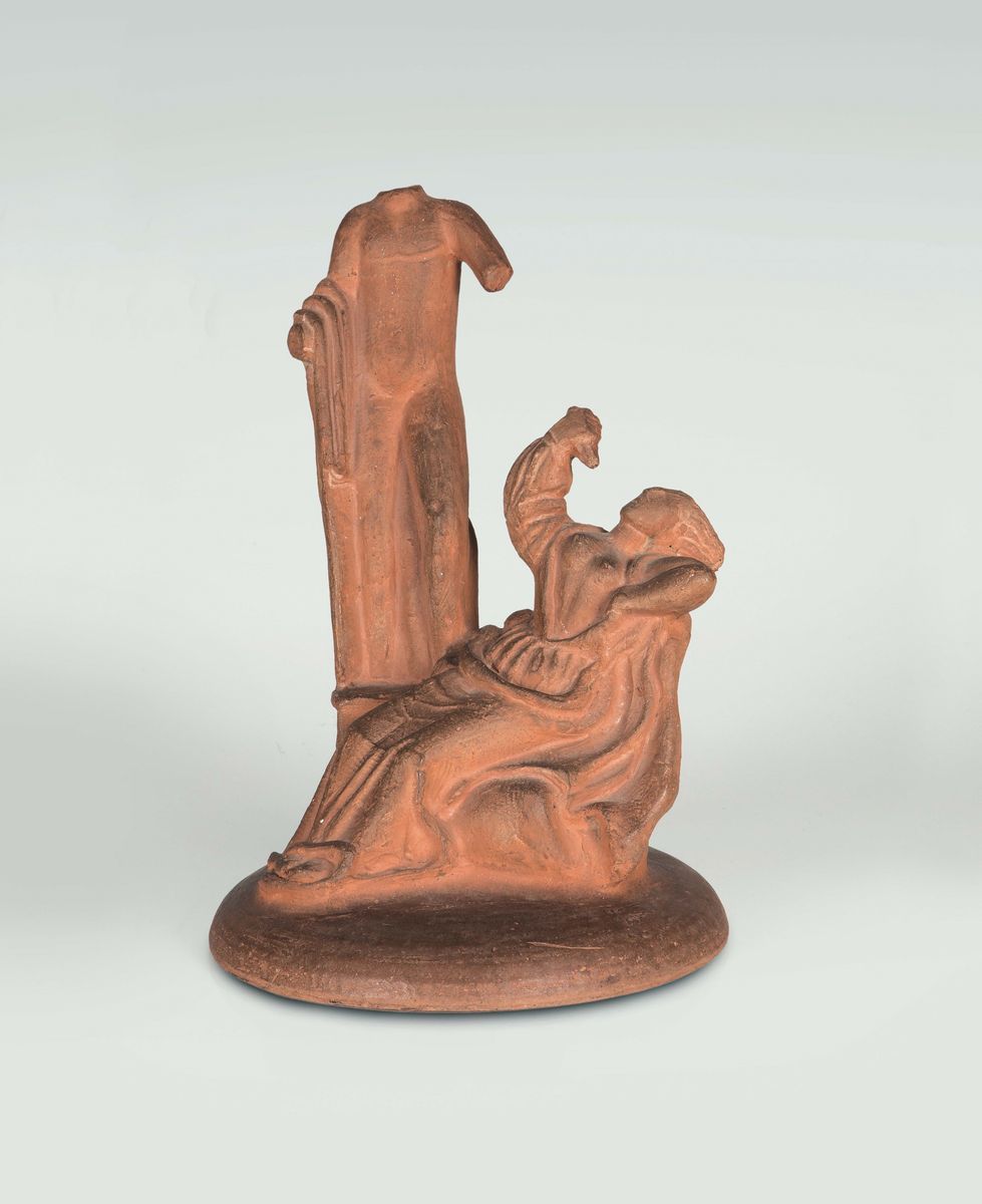 Gruppo plastico in terracotta non smaltata. Diametro cm 20; altezza cm 29,5Reca etichetta della Galleria Il Milione di Milano e firma sulla base