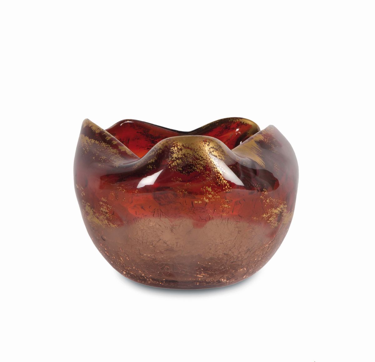 Vaso a sfera schiacciata in cristallo rosso con decoro floreale a smalti dorati. Altezza cm 11
