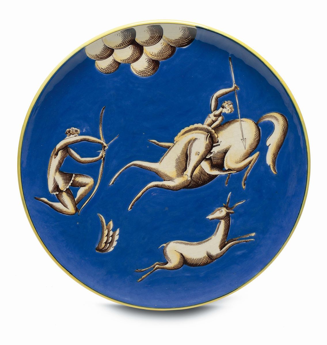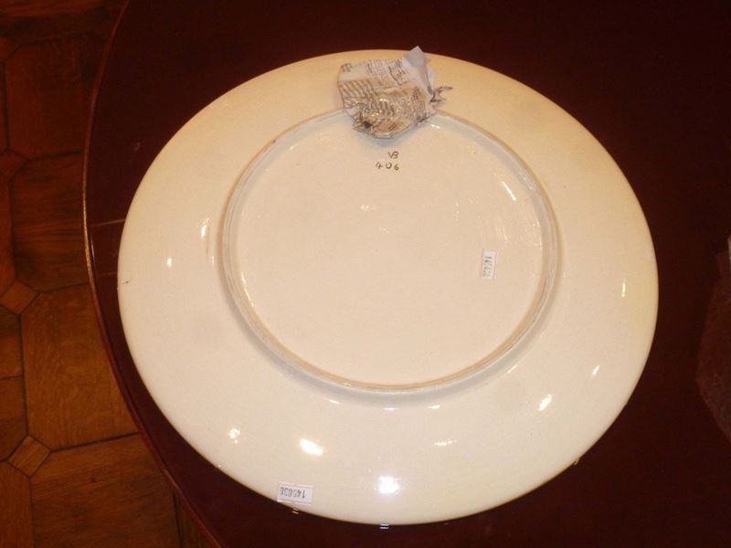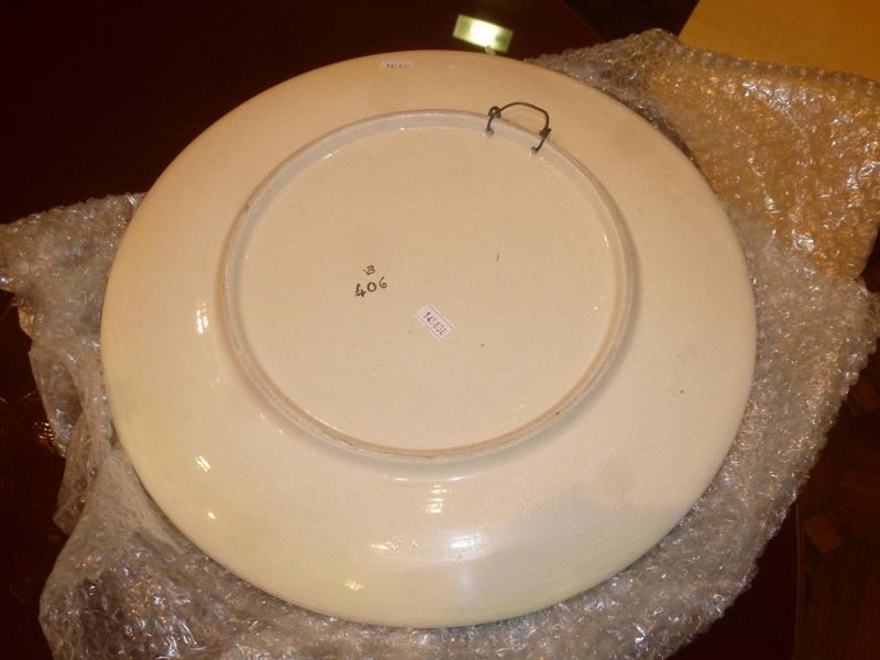 Due piatti in terraglia smaltata con decoro venatoria, Italia, XX secolo