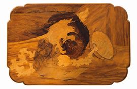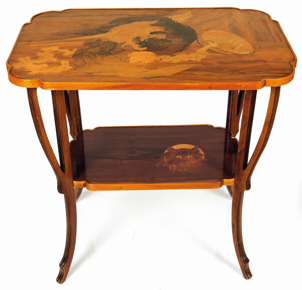 Tavolino a due ripiani intarsiato a marqueterie di essenze diverse, decoro di gatti sul piano superiore e inferiore. Dimensioni cm 75,5x50; altezza cm 74Firma intarsiata sul piano