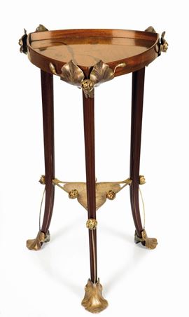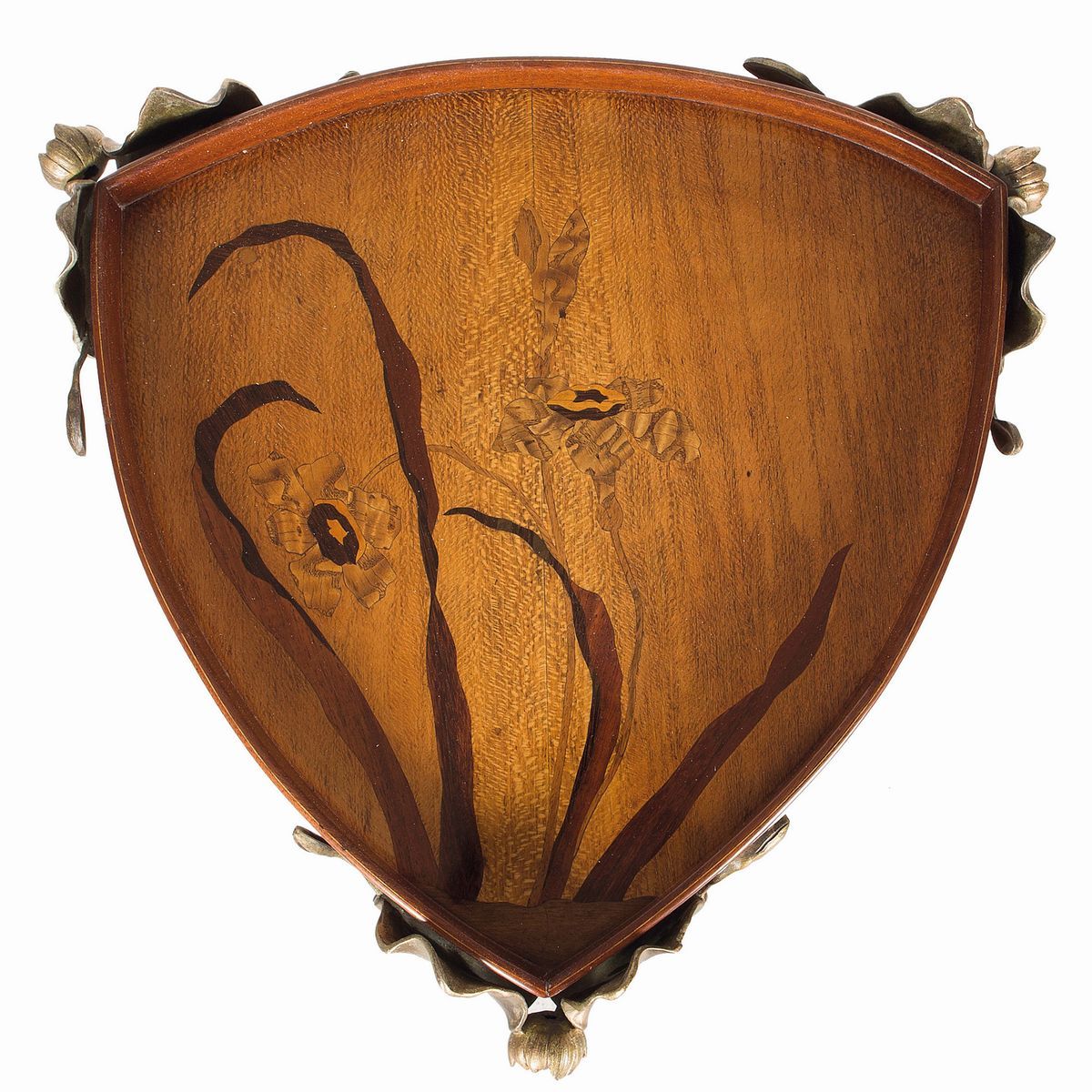 Tavolino triangolare lavorato a marqueterie di legni di essenze diverse a decoro di fiori sul piano superiore; piano inferiore, piedi e applicazioni in bronzo dorato a motivo vegetale. Dimensioni cm 44x44; altezza cm 84Firma incisa sul piano