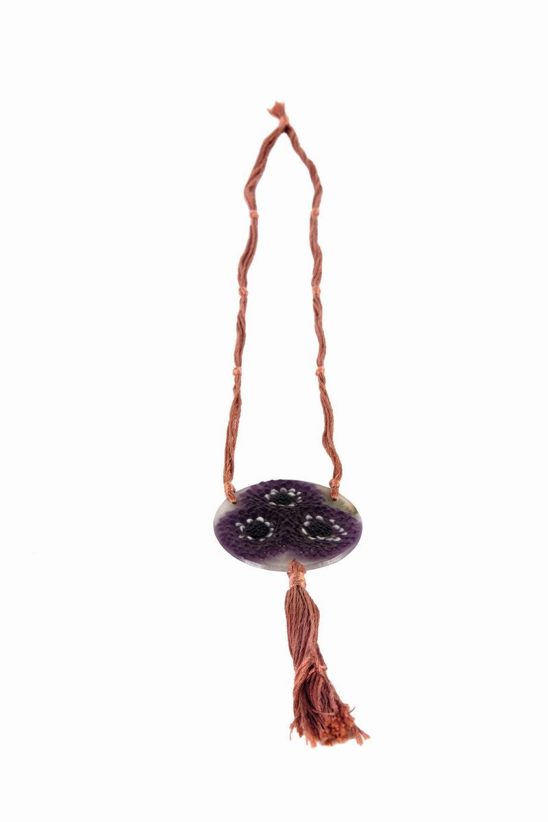 Una placchetta in pate de verre con decoro floreale. Cordone in seta. Diametro cm 6Monogramma impresso GAR