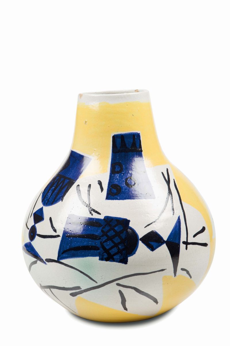 Grande vaso in ceramica maiolicata con decoro astratto. Altezza cm 41,5; diametro cm 36Firma sotto la base