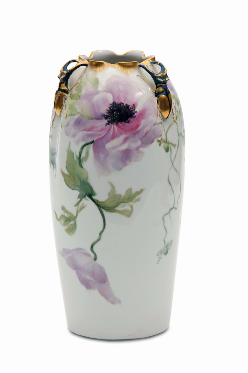 Vaso in porcellana con decoro floreale a smalti e cervi volanti dorati in alto rilievo. Altezza cm 29