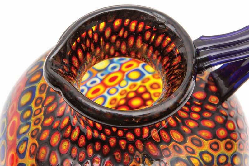 A large blue glass jug vase with handle and rim applied, entirely decorated with murrine bands in contrasting colours. 30 cm high; 20 cm diameter.
