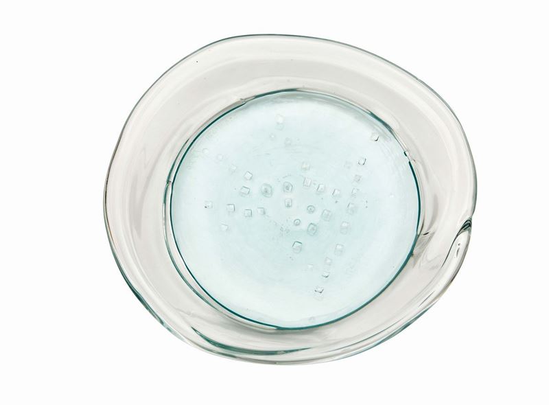 A large light blue incalamato glass and crystal plate with applications. Dimensions cm 37x34,5