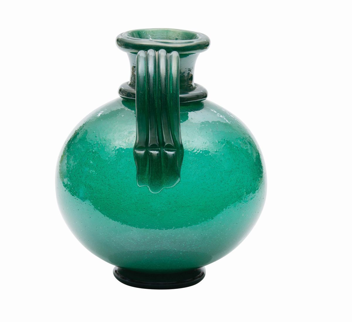 A green pulegoso glass vase with applied handles, foot and layers. 30 cm high; diameter cm 25