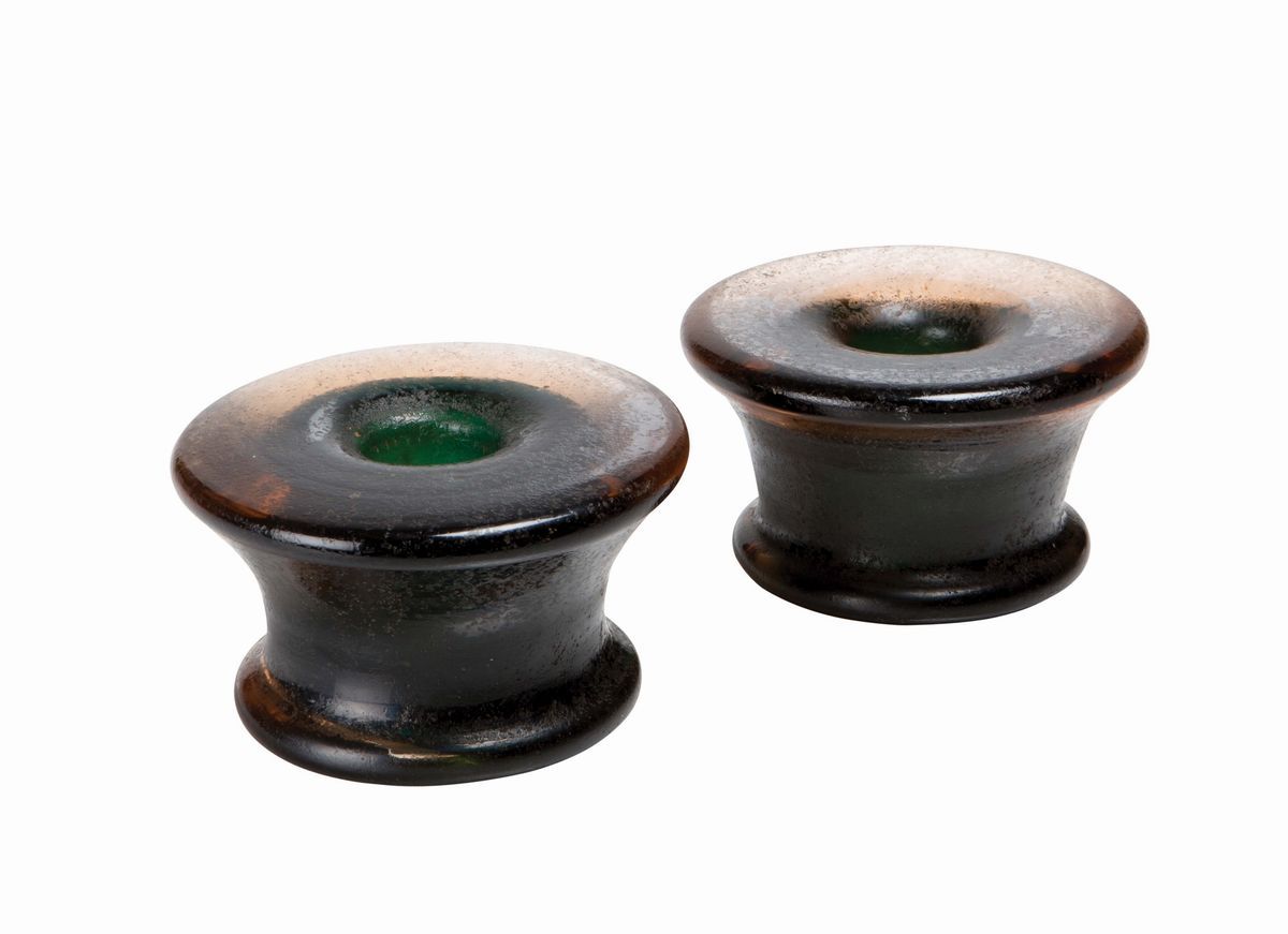 A pair of glass lamp bases with more layers, corroded surface. 7 cm high; diameter cm 11