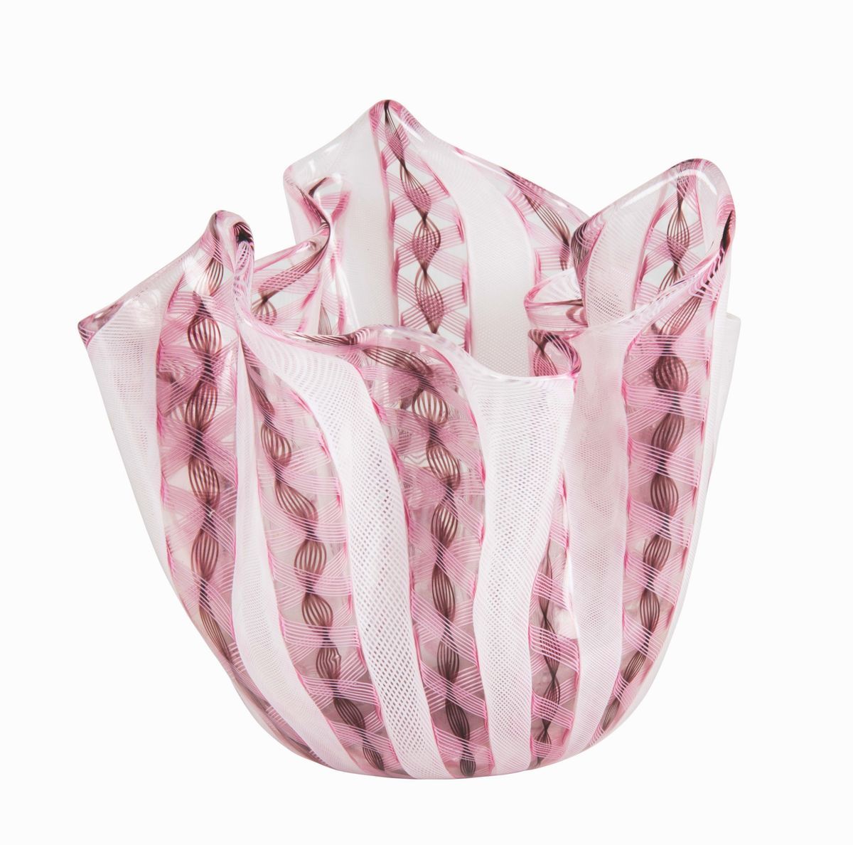 A blown glass “Fazzoletto” vase with pink and cyclamen bands. Diameter cm 18; 16 cm high
