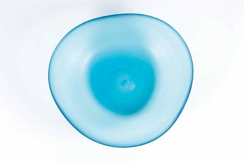 An exceptional trilobed aquamarine glass cup entirely wrought. Diameter cm 46; 15 cm high