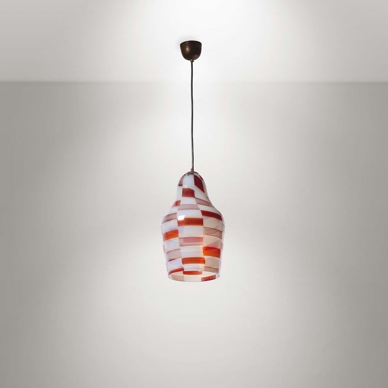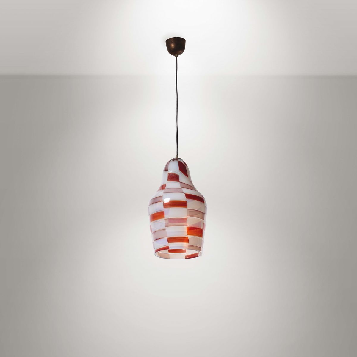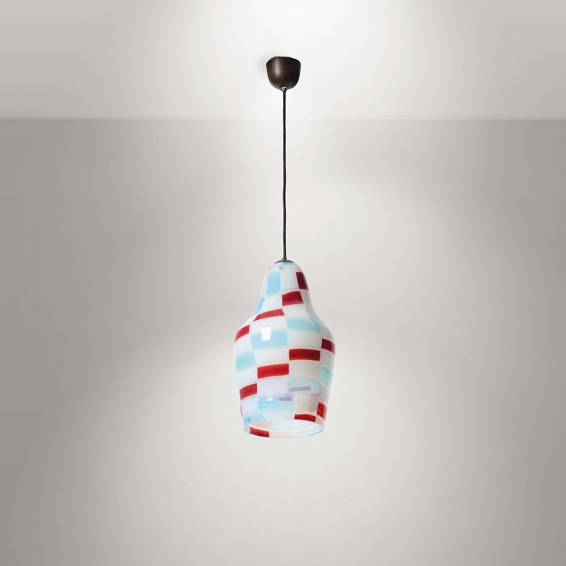 Gruppo di tre lampade a sospensione in vetro di Murano lavorato con tecnica a tessere colorate. Prod. Barovier&Toso, Italia, 1950 ca.cm. 21x34
