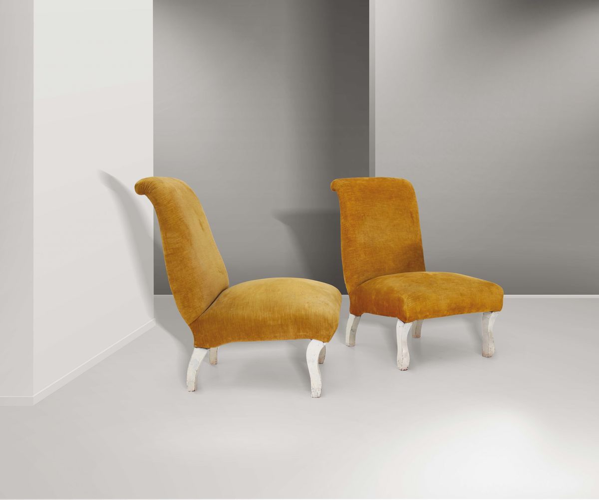 Coppia di poltroncine con struttura in legno e rivestimento in tessuto.
