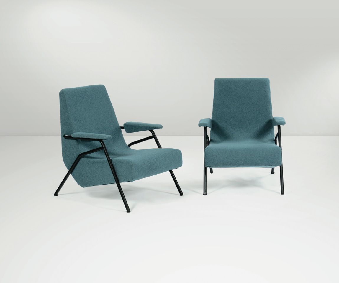 Coppia di poltrone con struttura in metallo laccato e rivestimento in tessuto.