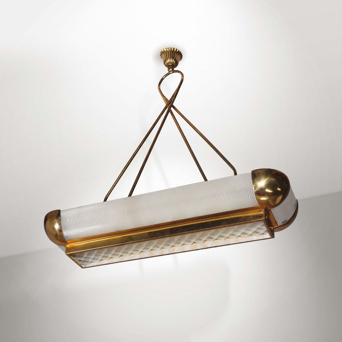 Lampada a sospensione con struttura in ottone e diffusori in plexyglass.