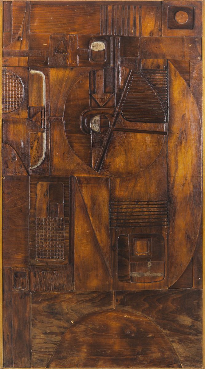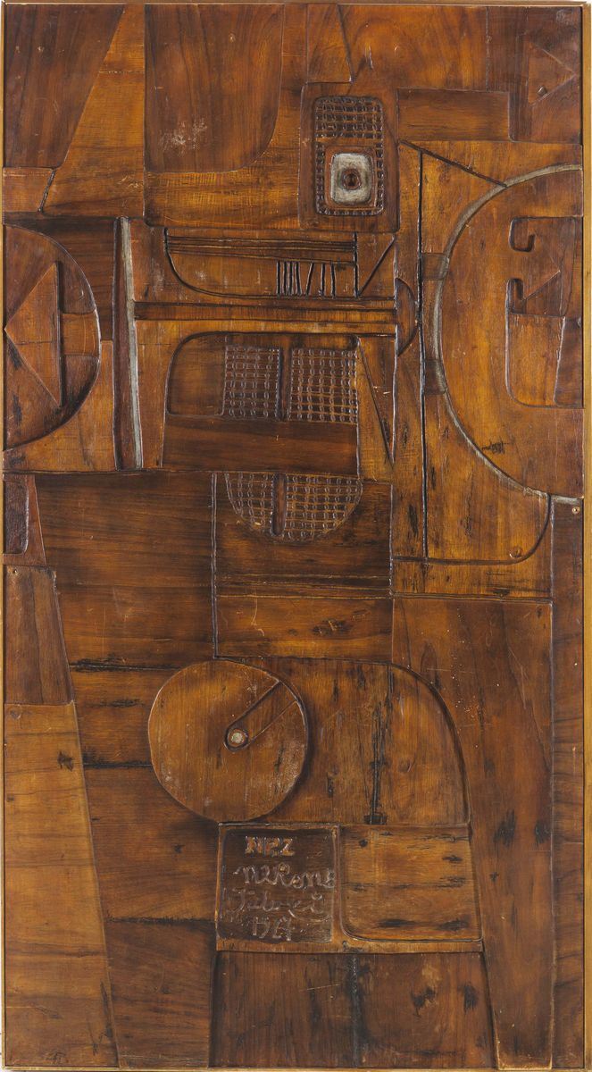 Altorilievo in legno pirografato. Firma originale. Certificato di autenticità.Prod. NP2, Italia, 1967cm. 110x196