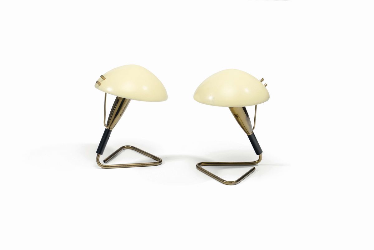 Coppia di lampade a parete in ottone lucido con diffusori in metallo laccato.Prod. Italia, 1950 ca.cm. 16x45x26