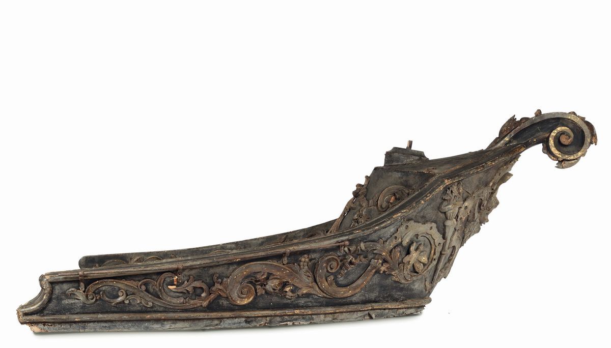 legno intagliato, laccato e parzialmente dorato, cm 480x190x130