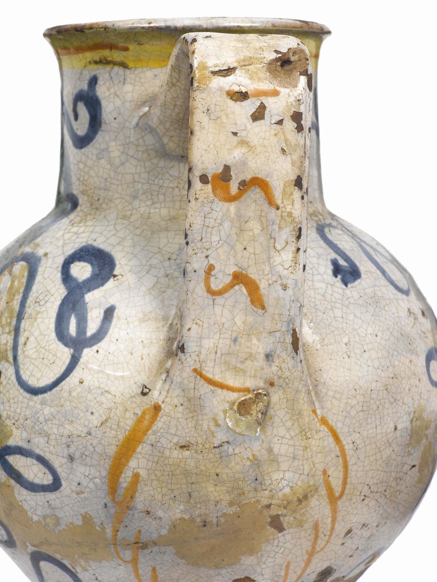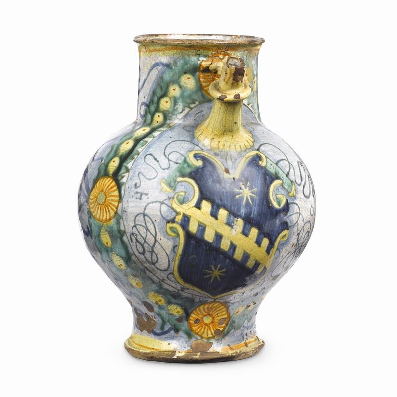 Il boccale mostra corpo sferoidale, poggiante su alto piede a base svasata con accenno d’orlo; è dotato inoltre di larga bocca ad alto colletto cilindrico, versatore a tubetto, unito al collo con un crodolo ritorto, e di robusto manico a nastro. Sulla zona anteriore, all’interno di un medaglione circolare, delimitato da un festone di foglie e frutta, campeggia uno stemma, con cornice accartocciata e legato da nastri ai fianchi, affiancato dalle inziali “T” e “O”; sulla zona retrostante, il manico presenta la data “1551 e all’attacco inferiore il disegno di una foglia (c). Dipinto in arancio, blu, giallo e verde. Significativo saggio, specie in ragione della data, della abbondante produzione di vasellami, caratterizzati da questa foggia per lo più destinata ai corredi da farmacia, è prodotti dalle officine dell’ Italia centrale nell’arco della prima metà del ‘500. Particolarmente derutesi sono la foggia della brocca, l’uso di campire col giallo carico il tubetto versatore, le decorazioni complementari al tema principale (stemma, simbolo e scritta farmaceutica), quali “trofei”, motivi “alla porcellana”, con dettagli a volte anche graffiti, il largo festone di foglie e frutta, ecc., e soprattutto lo stesso modo di tracciate le cifre delle date e di legare i medaglioni con nastri, talvolta riscontrabili anche in vasellami prodotti nelle vicine fabbriche eugubine. Circa l’identificazione dello stemma, c’è da osservare come il rimando più scontato sia agli Aldobrandini, il cui stemma però si differenzia per il numero delle stelle, che sono sei, ed altresì alle famiglie Sfondrati e Ranieri di Perugia, presente su diverse opere maiolicate 1, ma va segnalata particolarmente l’araldica della famiglia Aloisi, la cui blasonatura (“D’azzurro alla banda doppiomerlata d’oro accompagnata da due stelle di otto raggi d’oro”), corrisponderebbe maggiormente alla presente versione maiolicata. A queste ipotesi aggiungiamo, per completezza, quella della famiglia Reggio, la cui araldica è inclusa nel Blasonario Baccarini, della biblioteca comunale di Faenza. Tuttavia c’è da rilevare che le ipotesi avanzate non sono del tutto risolutive data la non corrispondenza tra le iniziali dei cognomi citati e quelle che compaiono a fianco dello stemma del nostro boccale. Si segnala inoltre, per auspicabili approfondimenti in merito, un boccale molto simile, nella foggia e nell’arma, pubblicato nel catalogo della vendita degli arredi della Villa l’Imperialino di Firenze 2. 1RAVANELLI GUIDOTTI 1988, pp. 116- 117, scheda 3 b. 2SAN MARCO 1969, n. 432, p. 149.