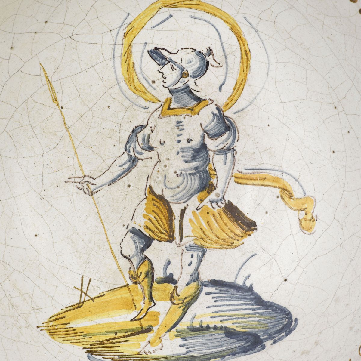 Catino di forma emisferica, poggiante su piede basso ad anello, con lieve incavo; è dotato inoltre di breve orlo estroflesso, rivolto in basso. Al centro della conca campeggia la figura di un soldato, in atto di incedere verso sinistra, armato di lunga lancia e paludato “all’antica”, con elmo, corazza e corta tunica; inoltre una sciarpa si snoda alle spalle del soldato e gli ruota attorno al capo. Dipinto in arancio, blu, bruno e giallo. Questo genere di catino nelle fonti faentine viene annotato come “cadino”, “cadino lavamani” o “lavacapo”, differenziati dai “cadini da barbiere”, detti anche “coppa da far la barba”, dotati del caratteristico scavo poggiagola; nell’inventario della bottega di Virigliotto Calamelli, del 1556, sono inoltre ripetutamente registrati “cadini grandi bianchi fini”, ed in quello dei Bettisi, del 1590, “cattini con le brocche”. I “cadini grandi bianchi fini” potevano accogliere temi legati alla cultura figurativa dell’“istoriato compendiario”: un’allegoria, uno stemma, un soldato come in questo caso, ecc. sempre interpretati con ductus sciolto, frutto dell’esercizio della mano, che sa compendiare di getto, con pochi efficacissimi tratti, il profilo, gli occhi, le mani ecc. cui giova a dare il senso del movimento anche il topos della sciarpa che ruota a cerchio sul capo della figura e si snoda dietro le spalle della stessa.